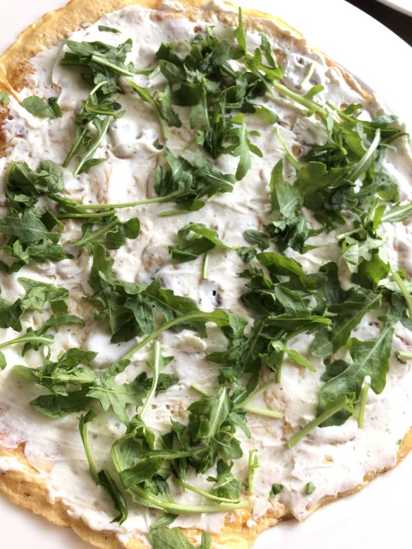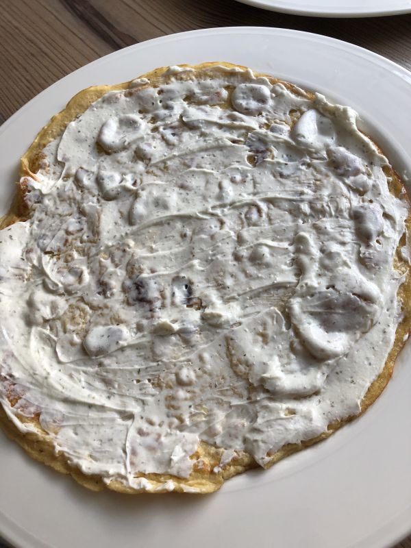 - Die Pfannkuchen mit dem Frischkäse bestreichen, mit Ruccola und Schinken belegen!