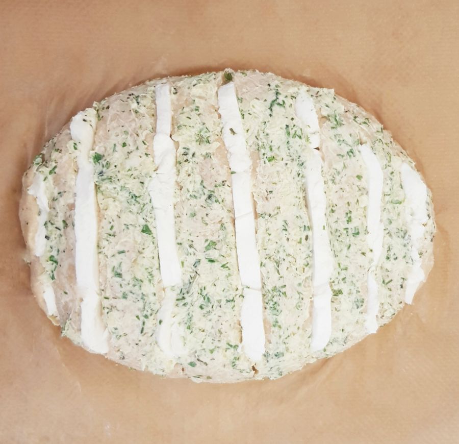 • In den Brotteig Streifen einschneiden und den Mozzarella in die Einschnitte legen. Die Knoblauchbutter über das gesamte Brot verteilen und bei 150 Grad (höher nicht weil der Knoblauch sonst verbrennt) 40 Minuten backen.