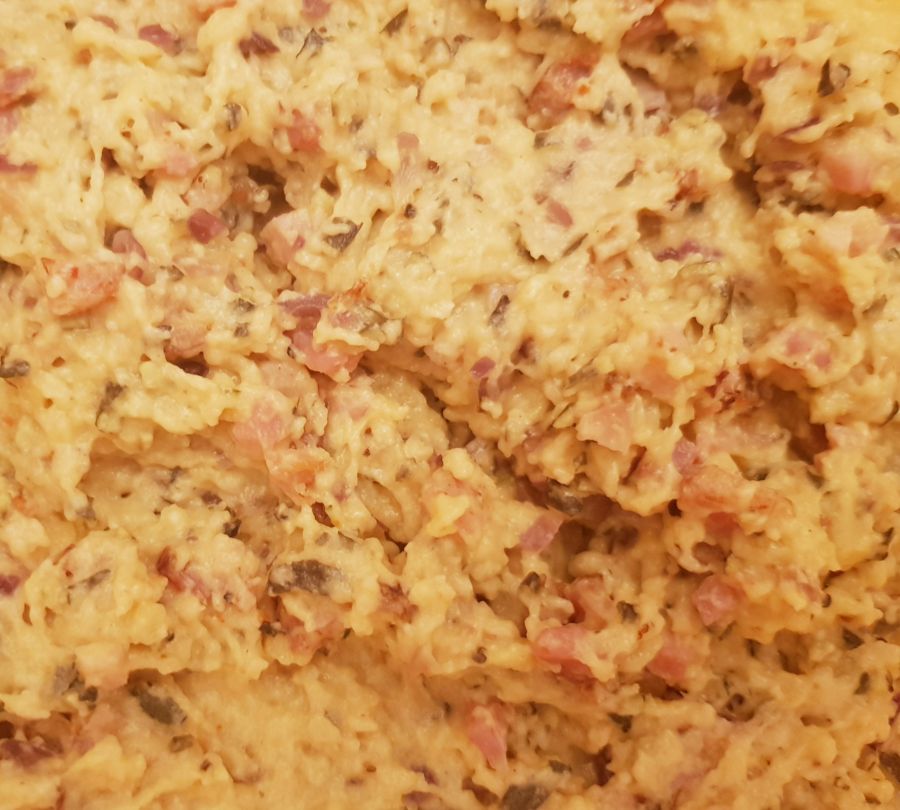 - Kochendes Wasser in eine Rührschüssel gießen und unter ständigem Rühren die Backmischung und Bambusfaser zugeben. 2 Minuten kräftig weiterrühren. Danach Gemüseliebling, Salz und die Eier zugeben. Gut 4 Minuten weiterrühren bis ein gleichmäßiger Teig entsteht. Die Speck/Zwiebelmischung und die Kürbiskerne untermengen und die Masse in einen Spritzsack ohne Tülle füllen.