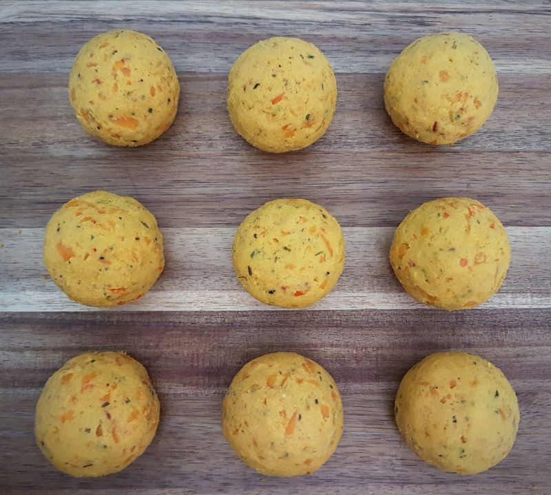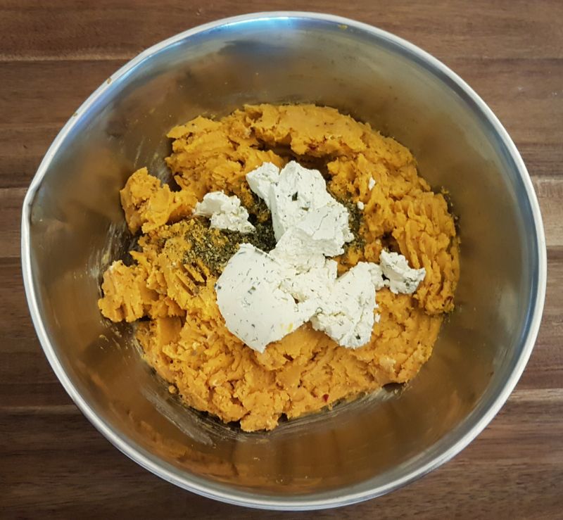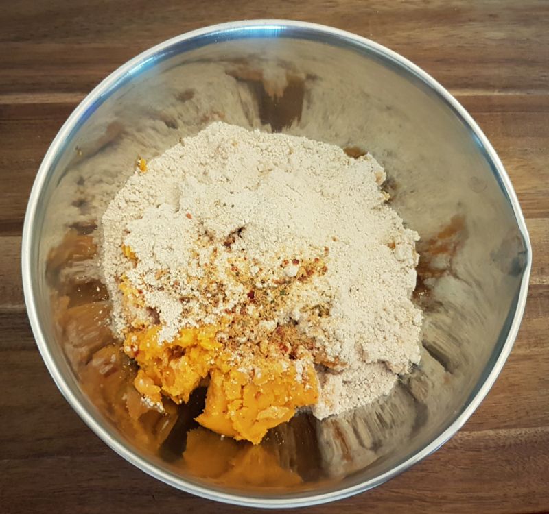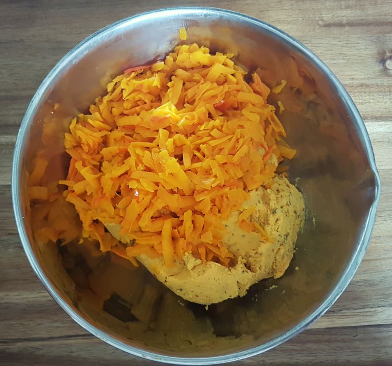 - Kürbispüree und Gemüseliebling mit Zitrusfaser pürieren, mit den Eiern, Salz, Butter, Knoblauch, Cheddar, Paniermehl und Kuchenzauber zu einem Teig verarbeiten.