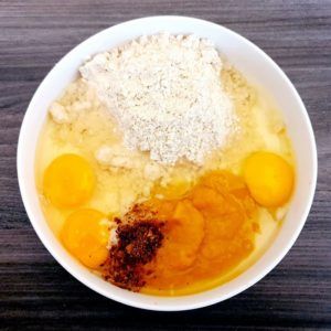 - Eier, Germknödelteig, Gewürze, Knofi, Frischkäse, Kürbispüree miteinander zu einem Teig verarbeiten. Dann die Hälfte der Zitrusfaser und Wasser untermengen und für 15 Minuten rasten lassen.