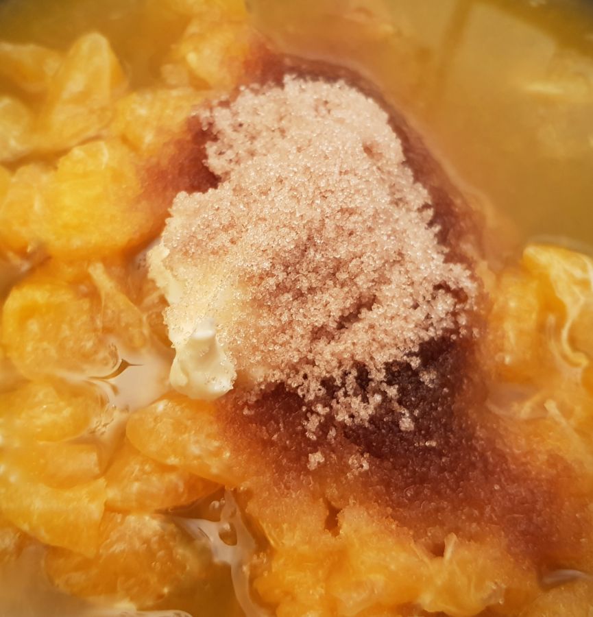 - Den Mandarinensaft mit dem Fruchtfleisch hinzufügen und unter Aufsicht auf hoher Flamme aufkochen lassen. Die Flamme etwas reduzieren und ein paar Minuten köcheln lassen (einreduzieren)