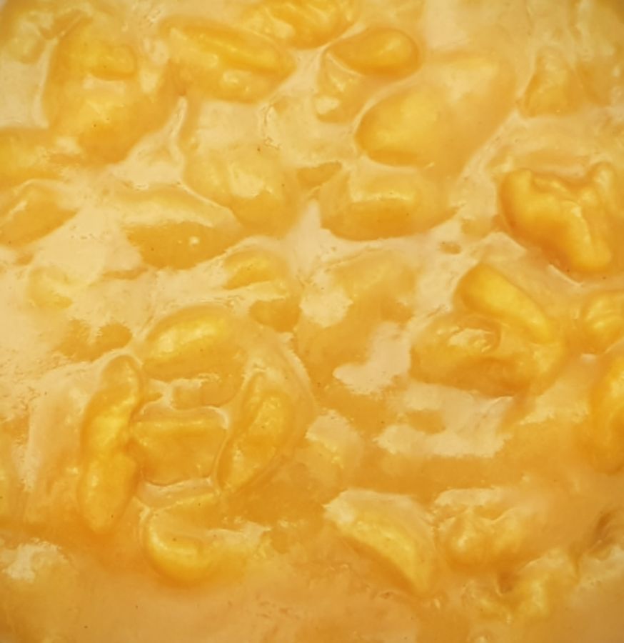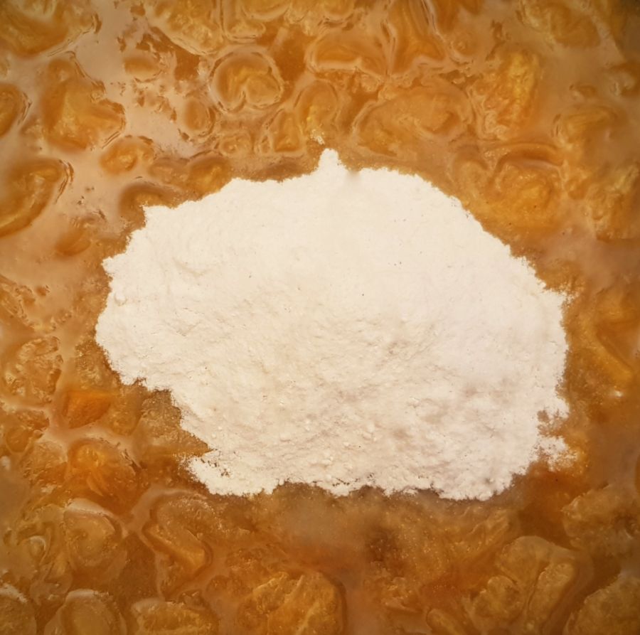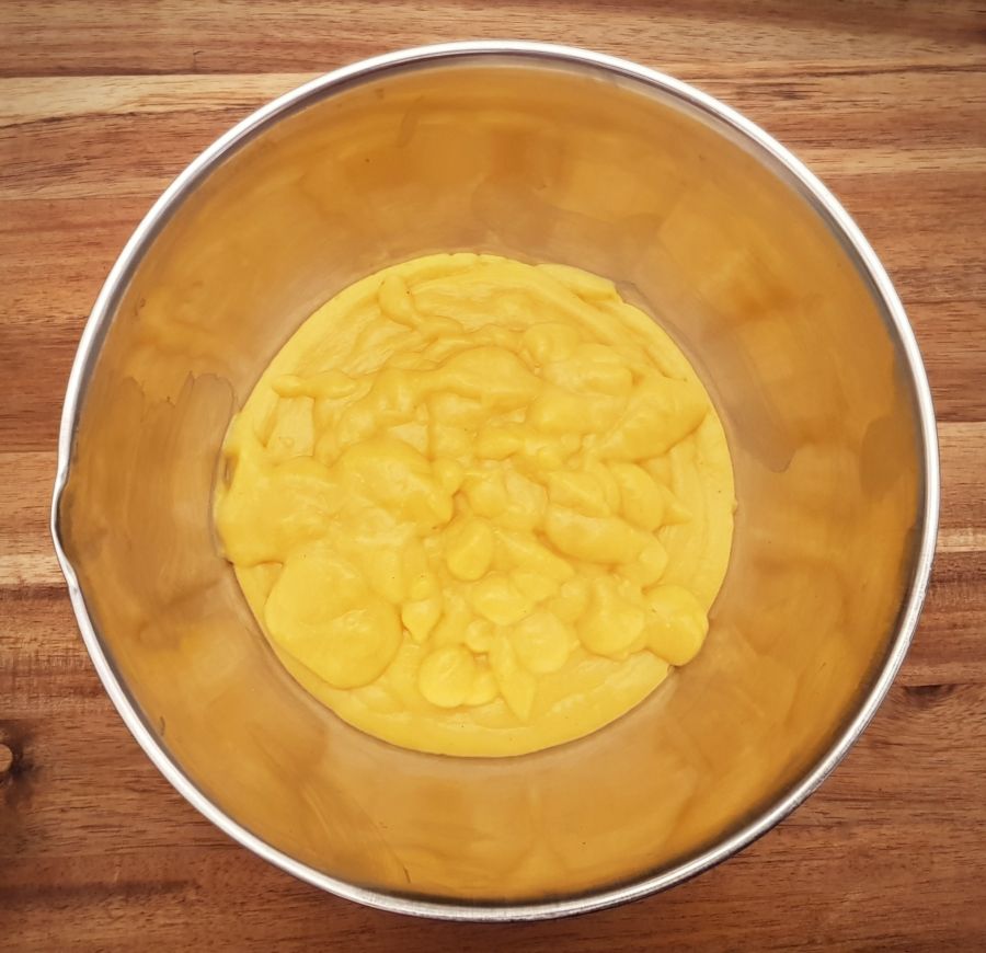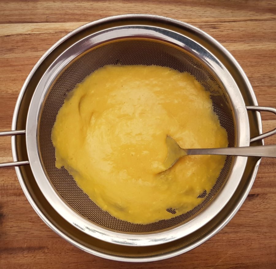 - Danach das Puddingpulver mit einem Schneebesen einrühren und einmal kurz aufkochen lassen. Die Masse durch ein Sieb streichen und wieder zurück in den Topf geben. Danach die Zitrusfaser, Pure Flavour und das Wasser mit Hilfe eines Pürierstabes vermixen bis sich eine sämige Konsistenz bildet. Noch einmal unter Umrühren kurz aufkochen. In einer Schüssel auskühlen lassen.