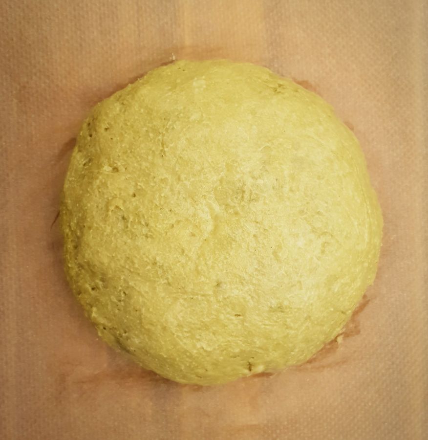 - Ei, Süße und Wasser miteinander vermischen, Mandelteig und Pistazienmus dazugeben und zu einem Teig verkneten.