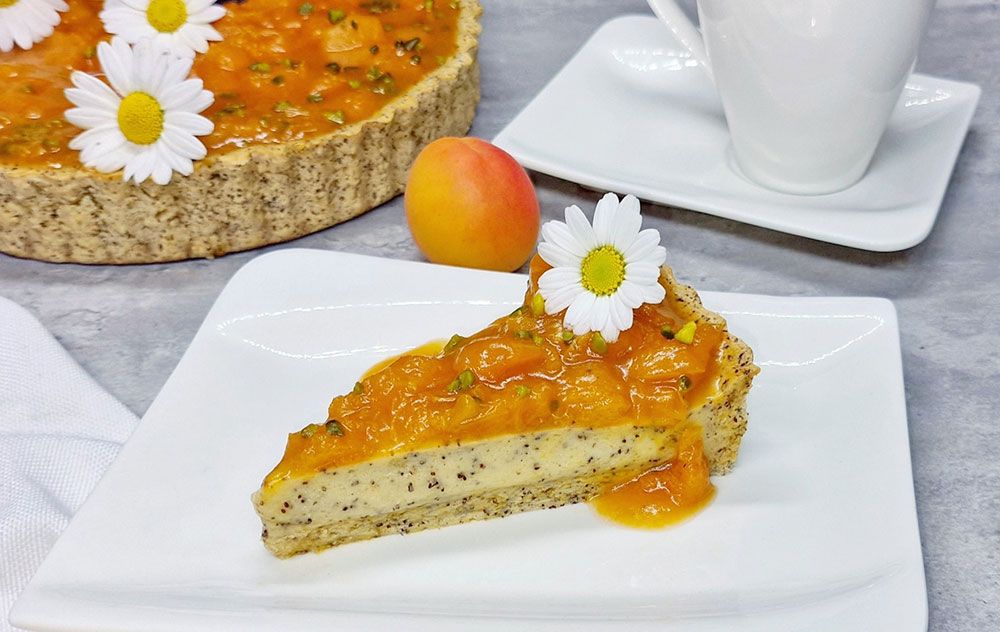 • Rezept Mohn Vanille Grießpudding Tarte mit Marillentopping low carb keto glutenfrei