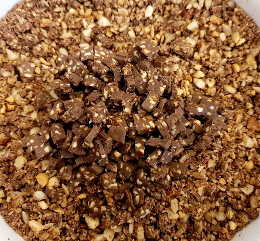 - Gebackenes Müsli in ein Sackerl füllen und mit etwas draufklopfen um sie zu zerkleinern. Müsli & Nussmischung miteinander vermengen.