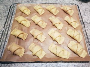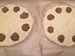 - Auf jedes Stück 1 TL Füllung geben (ca. 2 cm von der äußeren Kante entfernt). Den Teig von außen über die Füllung ziehen und die Kanten gut andrücken. Zum Schluss das dreieckige Stück von der Mitte her überziehen und ebenfalls gut festdrücken.