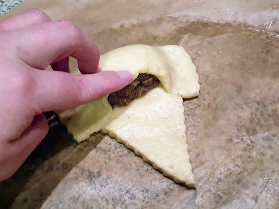 - Auf jedes Stück 1 TL Füllung geben (ca. 2 cm von der äußeren Kante entfernt). Den Teig von außen über die Füllung ziehen und die Kanten gut andrücken. Zum Schluss das dreieckige Stück von der Mitte her überziehen und ebenfalls gut festdrücken.