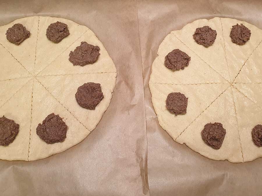 - Mit einem Teigroller je Kreis 8 Stücke vorschneiden.