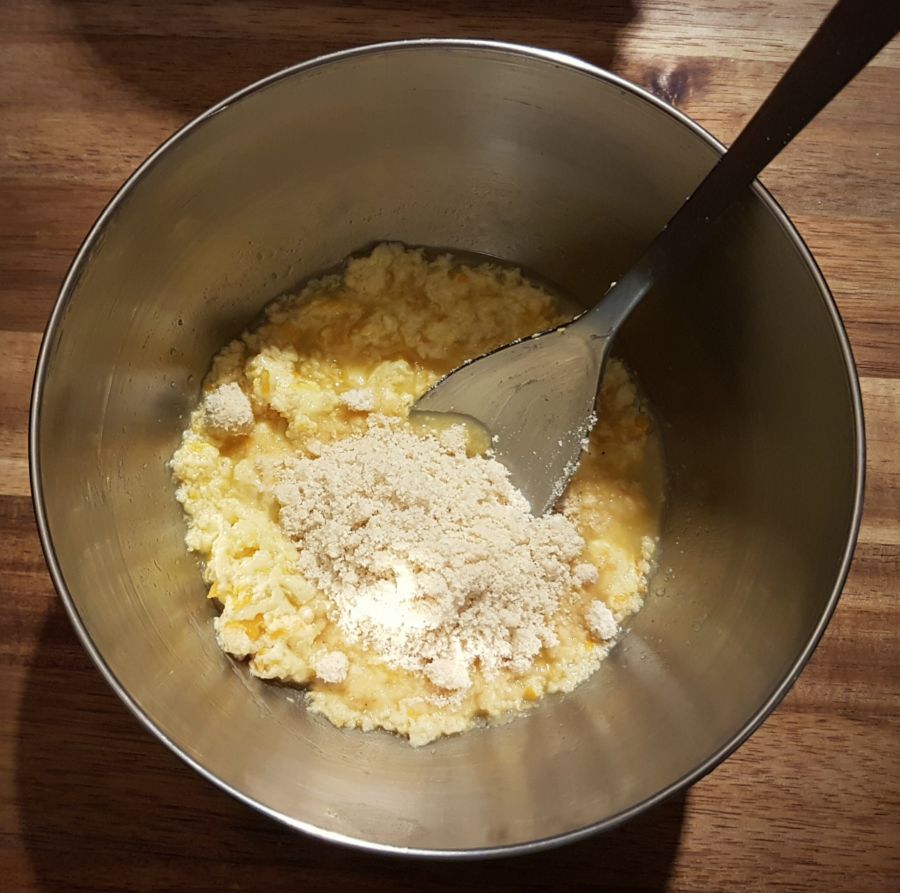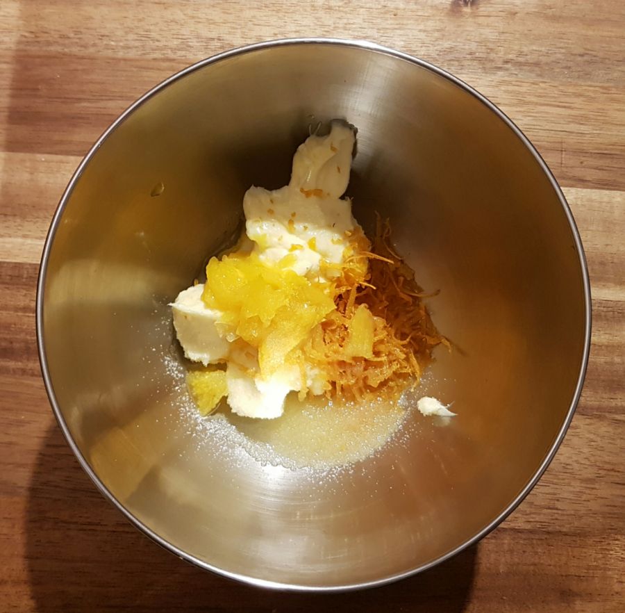 - Zesten, Butter, Orangensaft mit Fruchtfleisch, Salz, Süße und Pure Flavour miteinander vermengen, das Ei dazu rühren. Nicht erschrecken - die Masse verbindet sich noch nicht ganz.