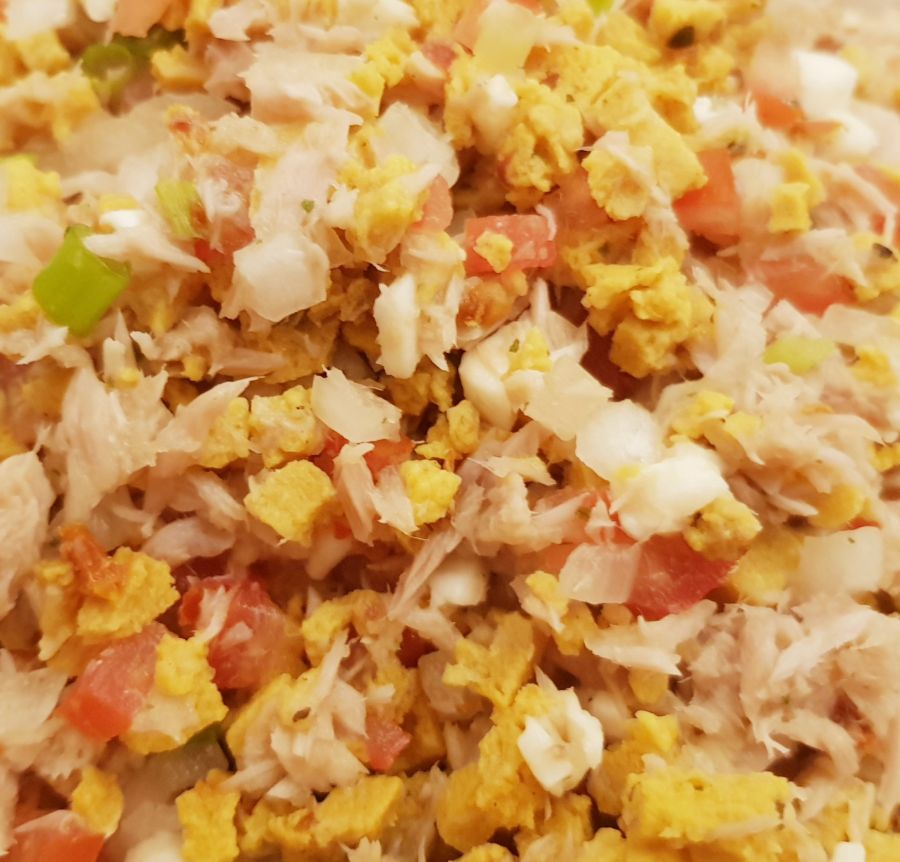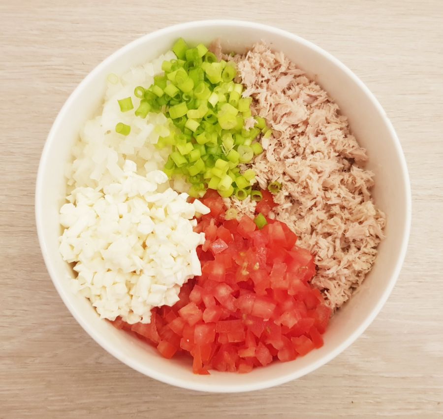 - In der Zwischenzeit Tomaten, Zwiebel, Mozzarella klein schneiden, den Thunfisch abgießen und etwas zerkleinern. Alles in einer Schüssel vermengen.