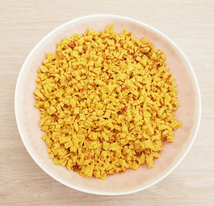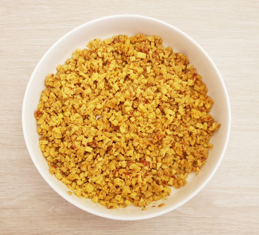 - Baguette & Ciabatta (Backmischung) mit etwas Kurkuma im Teig backen (die Farbe ist dadurch schöner im Salat). Den weichen Teil des Brotes ganz klein schneiden und in eine Schüssel füllen.