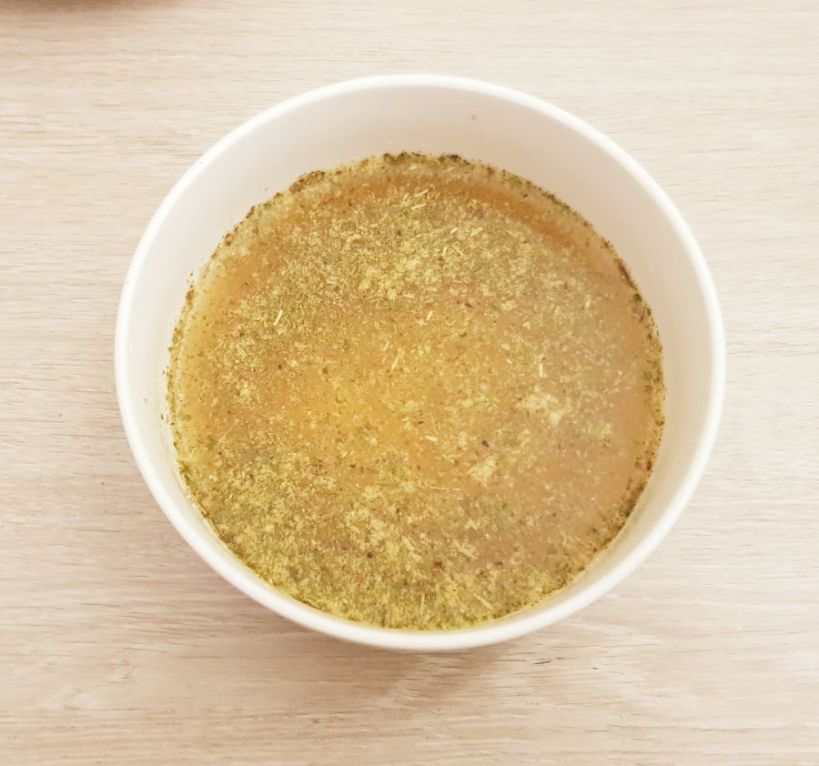 - Essig, Wasser, Zitronensaft und die Gewürze vermischen, über die Brotwürferl gießen und 1 h ziehen lassen.