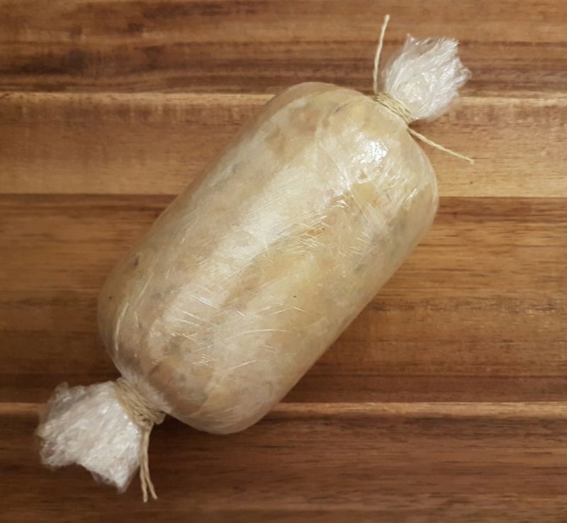 - Die zimmerwarme Butter mit der kalten Pfifferlmischung vermengen und zu einer Rolle drehen. Im Kühlschrank fest werden lassen.