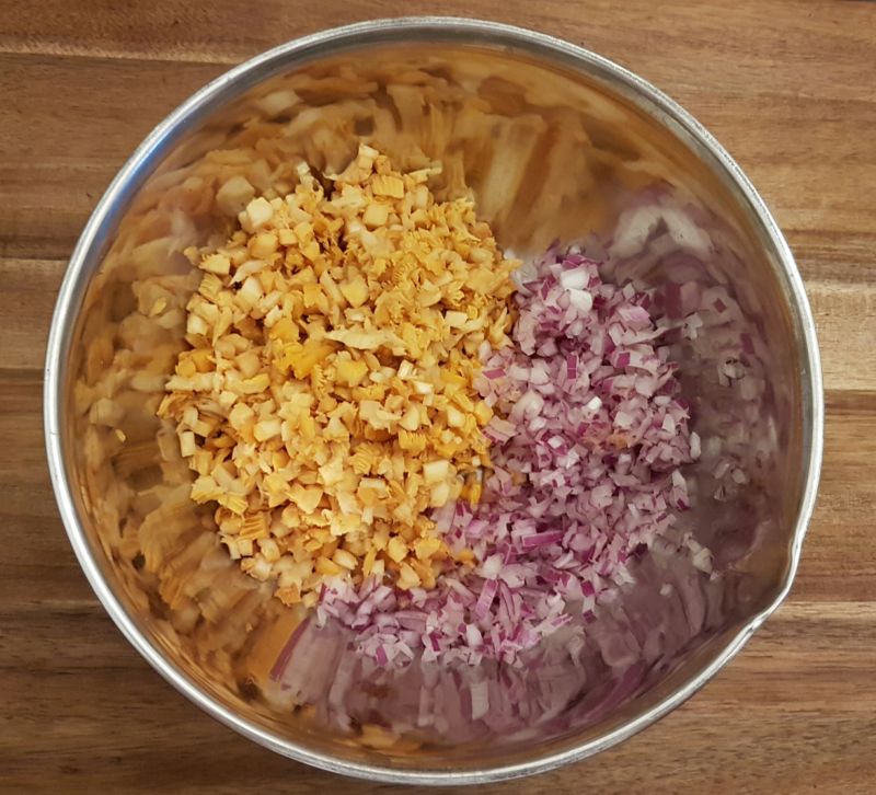 - In eine Schüssel geben, salzen und den geschnitten Schnittlauch untermischen. Die Mischung kalt werden lassen (Sehr wichtig!)