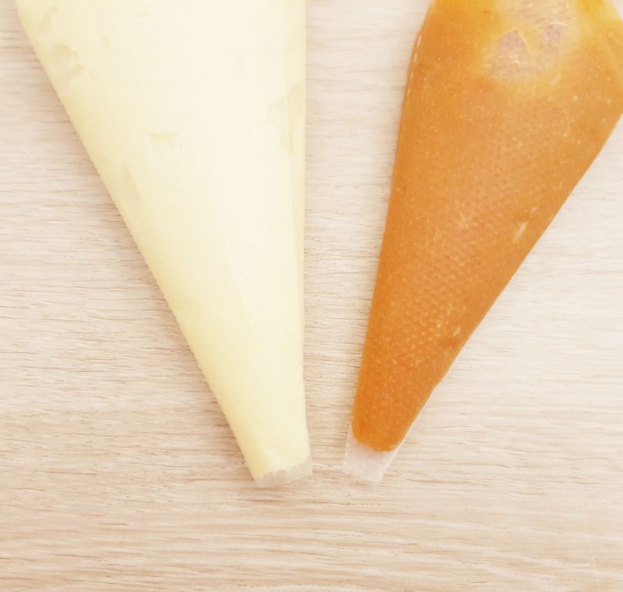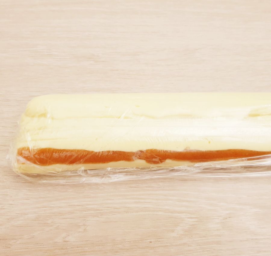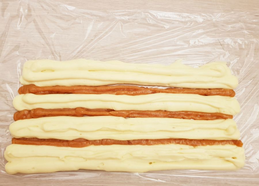 - Nach dem Aufschlagen die Creme in einen Spritzsack ohne Tülle füllen, die Pfirsichcreme auch. Einen Streifen Frischhaltefolie auflegen und Streifen in der Länge des Spritzsackes spritzen. Proteindessert dickere Streifen und Pfirsichcreme dünne Streifen spritzen. Dann einrollen und die Wurst in einen sauberen Spritzsack legen. Siehe Fotos - Durch Spritzen entstehen dann die Streifen.