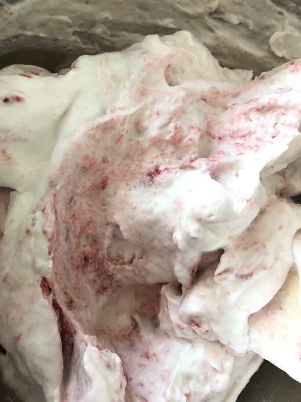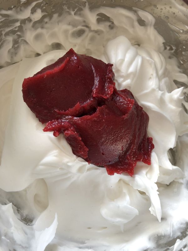 - Die Pflaumencreme auf den Fluff geben (Für die Deko etwas zurück lassen) und mit einem Spatel vorsichtig unterziehen bis es sich gut verteilt hat.