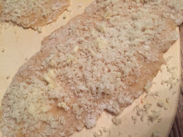 - Nun die ausgerollten Teigstücke mit Bergkäse und Knoblauch bestreuen - etwas Olivenöl draufträufeln (Variante 1) - oder am Schluss noch mit beliebigen Gewürz bestreuen. Dazu eignet sich besonders der "Gemüseliebling" oder das Pizza-Gewürz.