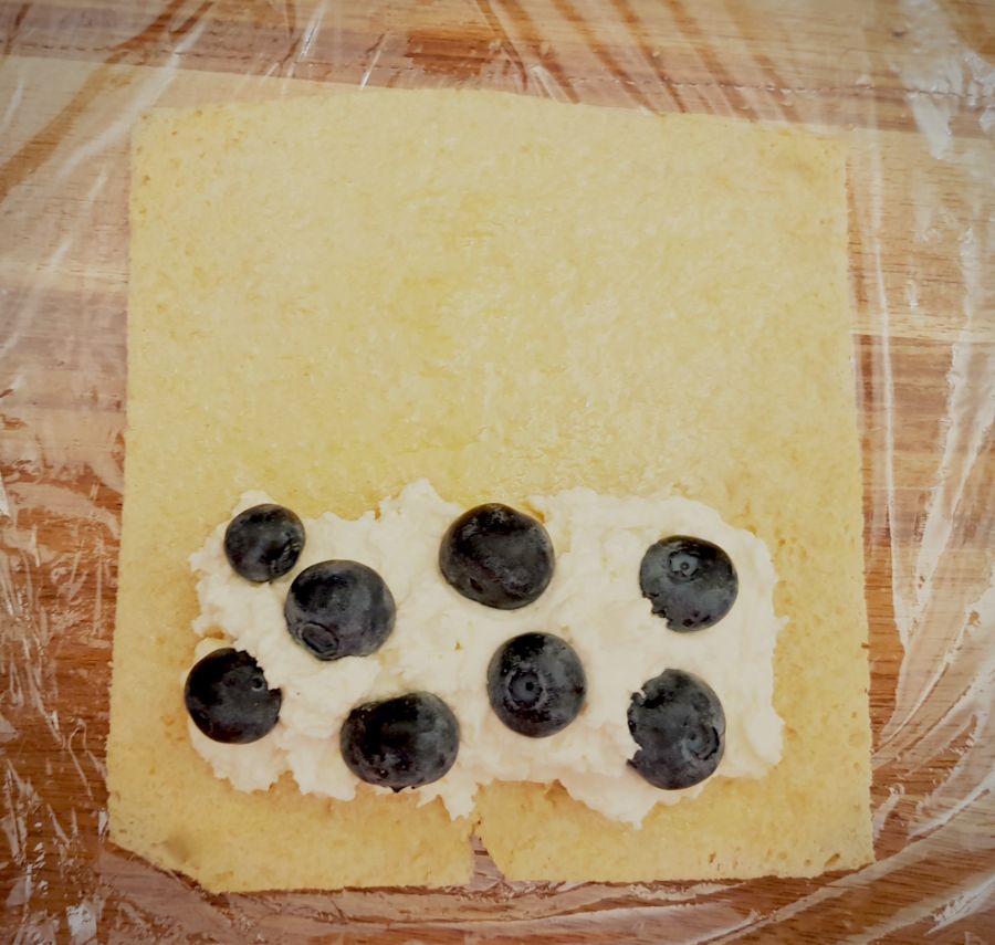 - 55g der Quarkmischung am oberem Rand verteilen, nicht bis zum Rand streichen, mit 10g Heidelbeeren belegen und den Rest mit Ei bestreichen und aufrollen. Die Seitenteile einfach andrücken. Mit der Folie eindrehen.