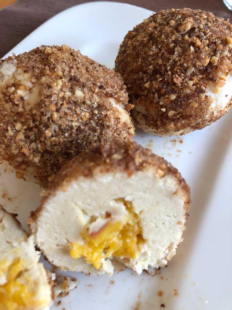 - ACHTUNG: Solltet Ihr L-Eier oder andere Quarksorten verwenden, kann es sein, dass Ihr noch ca. 10g Zitrusfaser nachgeben müsst. Macht einfach einen kleinen Probeknödel ohne Füllung und gebt ihn in leicht siedendes Wasser und lasst ihn durchziehn. Er darf nicht auseinanderfallen - muss kompakt bleiben - siehe Bild unten. Löst sich zuviel Teig, einfach noch Zitrusfaser in den Teig geben.