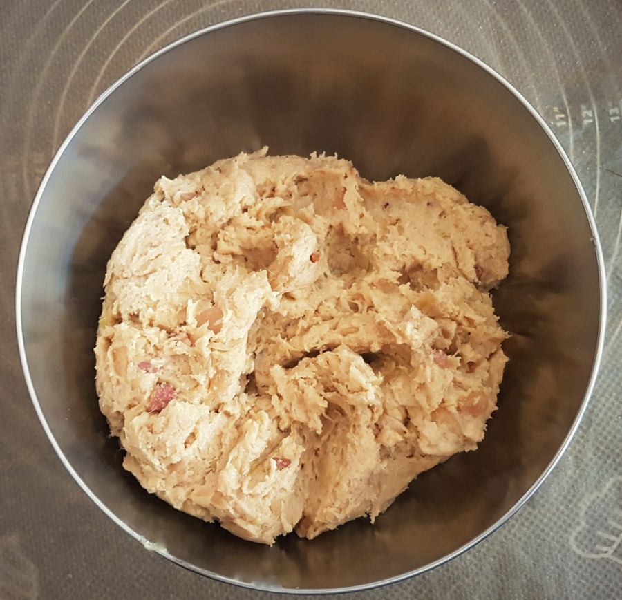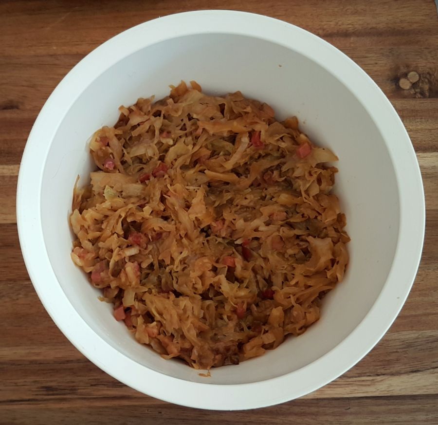 - Trockene Zutaten vermengen. Eier und weiche Butter dazugeben und vermischen, Brotgewürz, Salz und Wasser dazugeben und den Teig zubereiten. Unter den Teig 250g des Speckkrauts geben und vermengen.