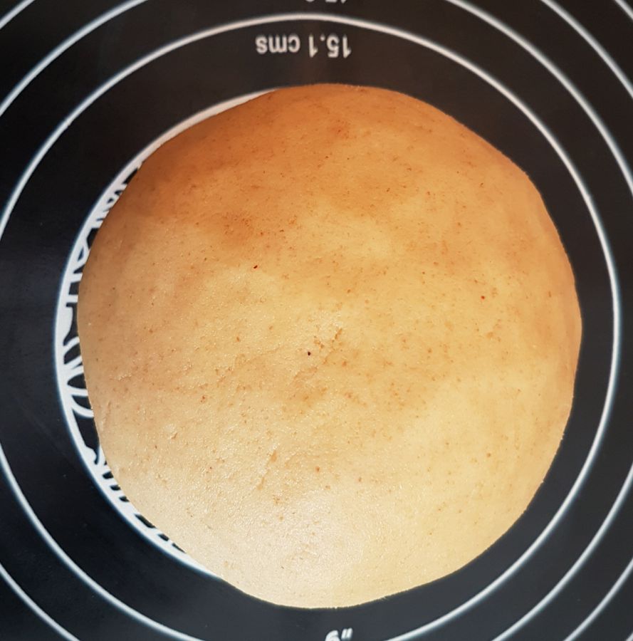 - Auf einem Backpapier den Teig mit den Fingern glatt streichen und 250g vom Speckkraut auf dem Teig verteilen. Die Ränder aussparen. (siehe Bilder) Den Teig vorsichtig mit Hilfe des Backpapiers aufrollen und ein Laibchen draus formen. Mit Ei bestreichen und mit Bambusfasern bestreuen.