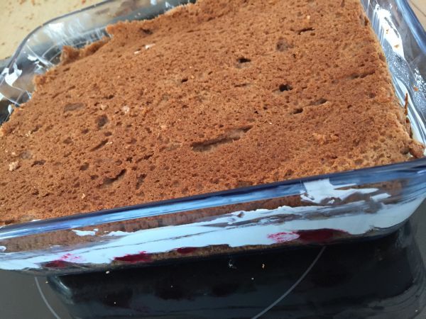 - Die Kirschen auf dem Boden verteilen und mit der Hälfte der Creme bedecken.