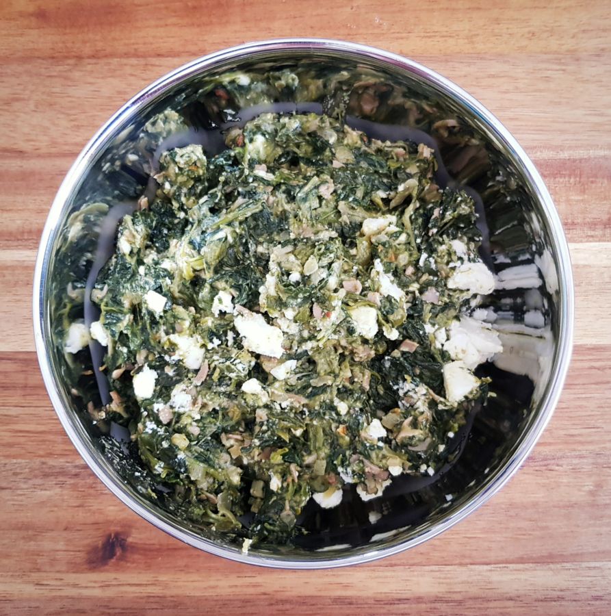 - Blattspinat dämpfen, in der Zwischenzeit Schinken ganz klein würfeln, Paprika und Knoblauch auch klein würfeln und mit dem Schinken in Ghee anbraten. Den gedämpften Spinat in die Pfanne dazu geben und mit 50 ml Wasser aufgießen, würzen und so lange köcheln bis das Wasser verkocht ist. Mit Creme Fraiche verfeinern und die Zitrusfaser unter die Masse rühren. 2/3 vom Feta in die Spinatmasse bröseln und miteinander vermischen. In eine Schüssel zum Abkühlen füllen.