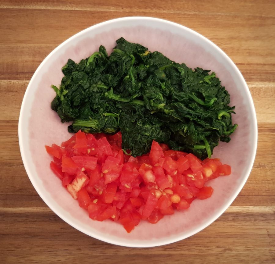 • Tomatenstücke, Spinat, Knoblauch gepresst und Gewürze in Ghee anbraten, mit Wasser aufgießen und weiter kochen bis die Flüssigkeit verkocht ist. In eine Schüssel geben und etwas abkühlen lassen, dann den Feta zerbröseln und unterheben.