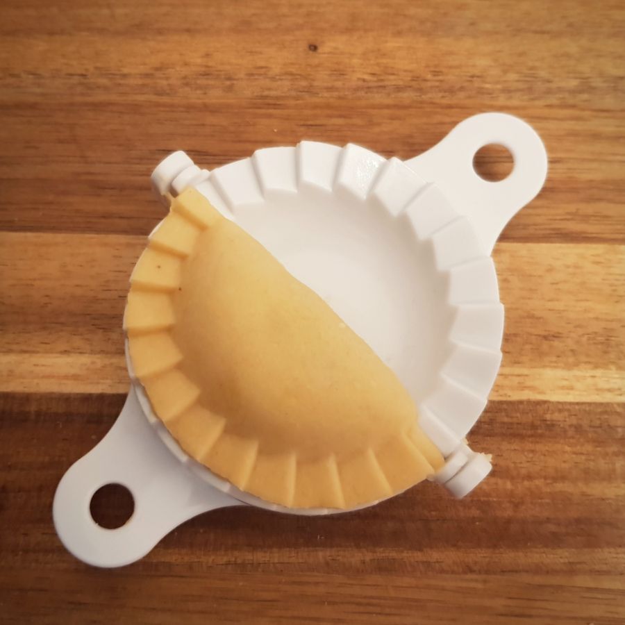 • Je 1 Kreis in den Teigtaschenformer legen, je 10g Spinatfülle in die Mitte legen und eine Tasche formen. Beim zusammenpressen den Überschuss mit einer Messerspitze abtrennen und mit einem feuchten Finger über den Rand streichen. So werden die Taschen schön gleichmäßig.