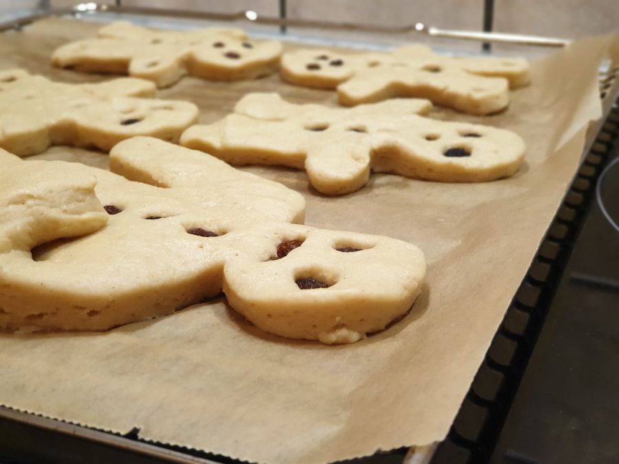 - Den Teig mit feuchten Händen auf Backpapier auf ca. 1.5 cm dick ausrollen und die Figuren mit einem Ausstecher ausschneiden.