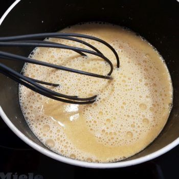 - Die Butter in einem Topf schmelzen und unter ständigem Rühren bei mittlerer Hitze brutzeln lassen. Am Anfang schäumt es noch etwas stärker, da die in dem Butter enthaltene Feuchtigkeit verdampft. Sobald das Schäumen nachlässt, ist Vorsicht angesagt!
