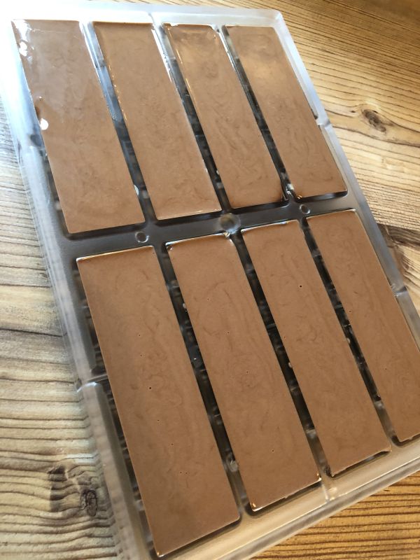 - Nun komplett alles ca. 2h durchkühlen lassen. Danach die Schokolade aus der Form nehmen. Die Riegel fallen normal beim Stürzen von alleine raus.