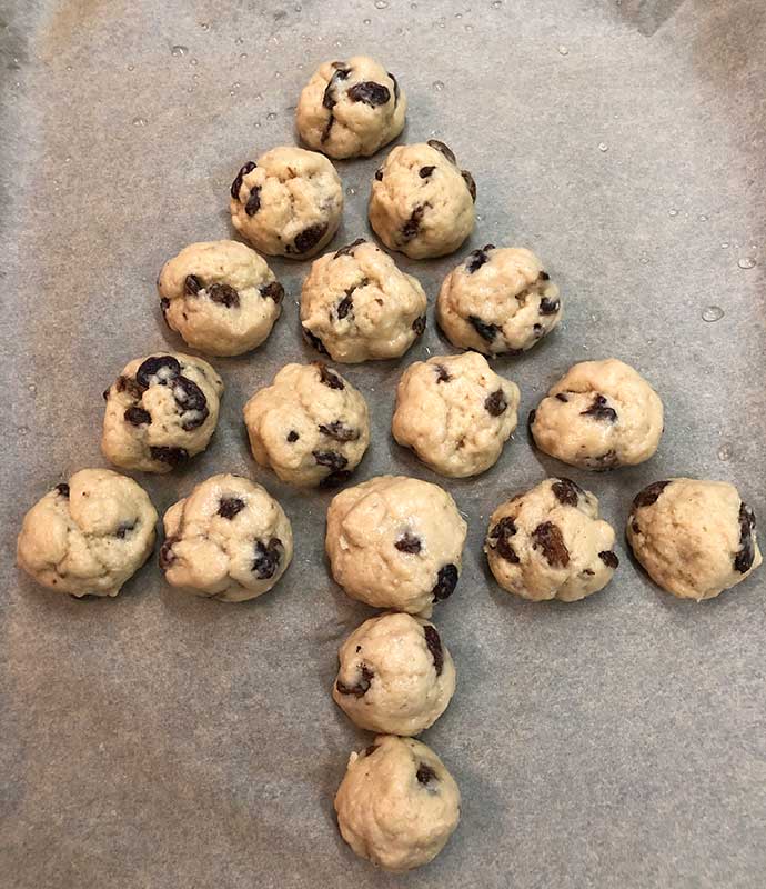- Aus den Teig 17 Stück Bällchen formen. Die Bällchen auf einem mit Backpapier belegten Blech als Baum anordnen. Zwischen den Bällchen unbedingt 1 cm Abstand lassen - wächst beim Backen zusammen. Leicht mit Bambusfaser besieben für die Schneeoptik.