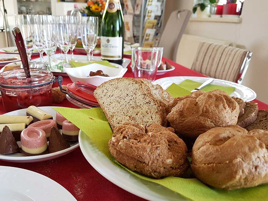 Zur Stärkung gab es dann hinterher frisch gebackenes Dr. Almond-Brot. Dazu selbstgemachte Pralinen, Nougatcreme und zum Anstoßen auf die gute Zusammenarbeit ein Gläschen Sekt.