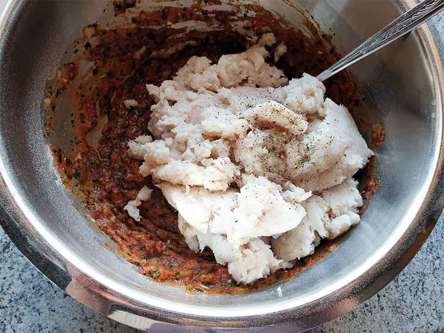 Mit einer Gabel so lange vermengen, bis die Masse formbar ist. In 6 gleichgroße Portionen teilen.