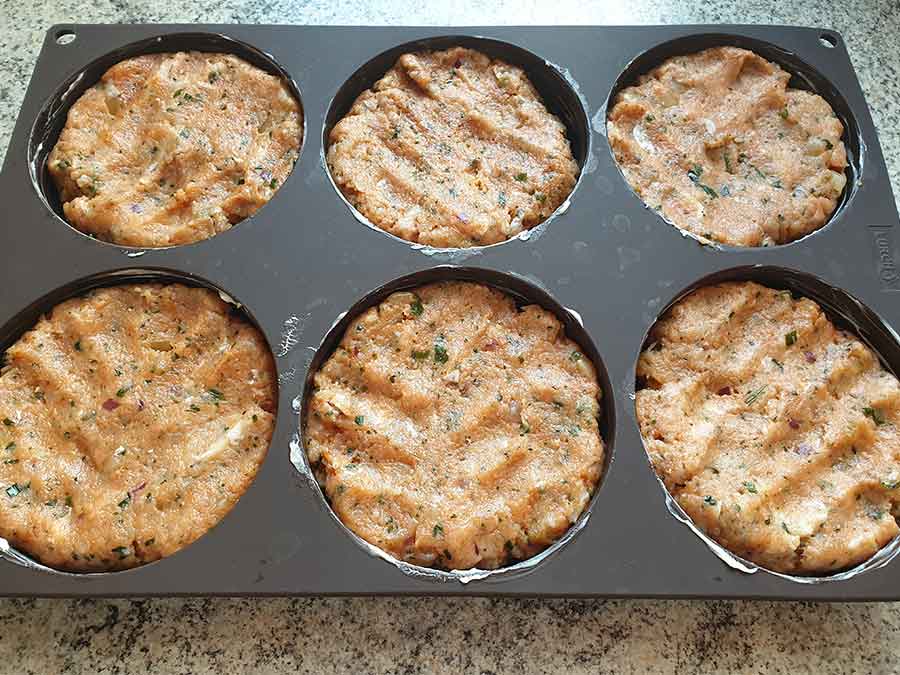Die Silikonform gut mit Butter einfetten, die Frikadellenmasse einfüllen und im vorgeheizten Backofen (Umluft) 20 min bei 190 °C und 15 min bei 175 °C backen.