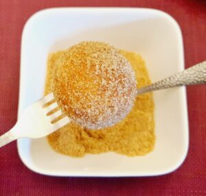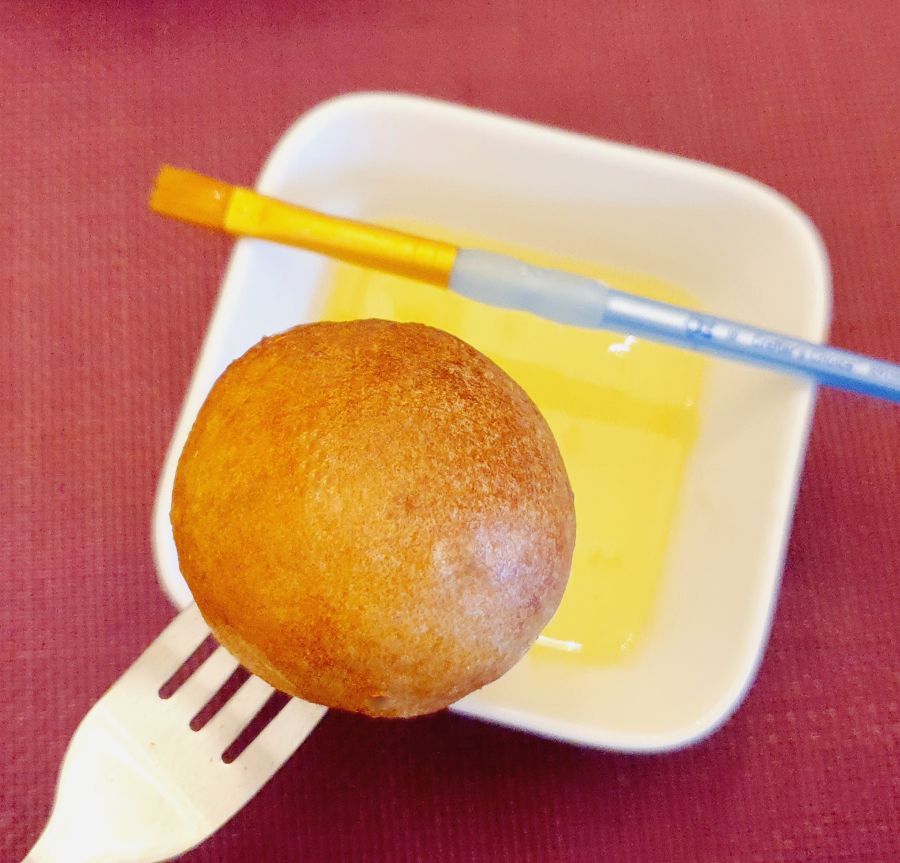 Die Krapfenbälle auf eine Gabel stecken, ganz nach vorne ziehen damit sie nicht runterfallen und mit dem Pinsel komplett mit Eiweiß bestreichen.
