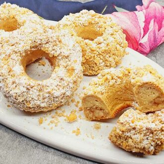 Nach dem Backen aus dem Backrohr nehmen und vorsichtig auf ein Gitter stürzen. Etwas abkühlen lassen. Sobald man sie angreifen kann, ohne sich zu verbrennen, großzügig mit Eiklar bestreichen und mit Streusel ummanteln.