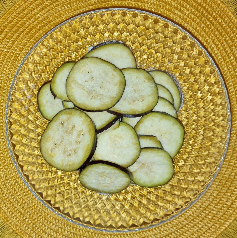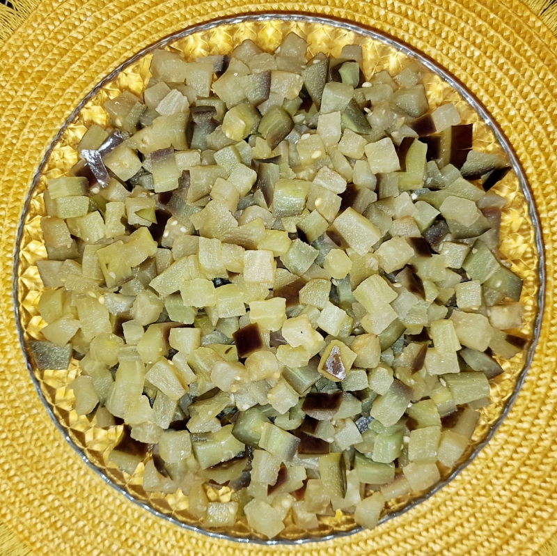Auberginen in kleine Würfel schneiden und mit einer halben Zitrone beträufeln - kurz durchmischen - so werden sie nicht dunkel.