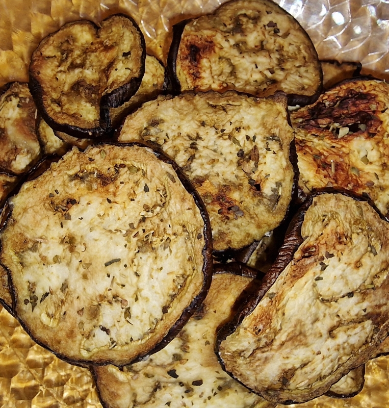 Während der Kochzeit hab ich eine kleine Aubergine in Scheiben geschnitten, mit Zitrone beträufelt (restliche Zitrone) und eingesalzen, damit sie Wasser zieht. Die Scheiben mit Küchentuch getrocknet, mit etwas Öl auf beiden Seiten eingepinselt und mit Dr. Almond Pizza Pizza Gewürz und Salz gewürzt. Im Backofen bei 170 Grad Umluft für 15 - 20 Minuten gebacken.