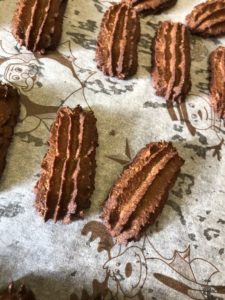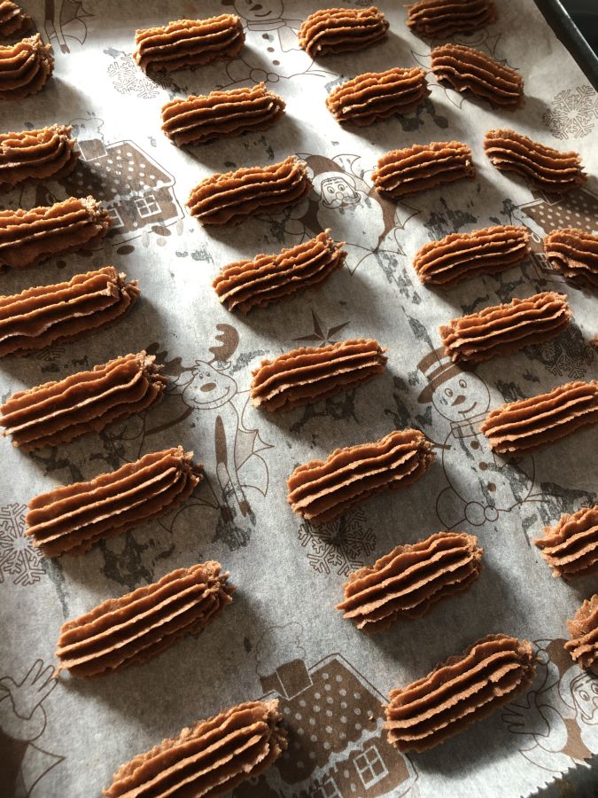 Mit einem Spritzbeutel etc. Stangen auf ein mit Backpapier ausgelegtes Backblech spritzen. (Ca. 30 Stück)