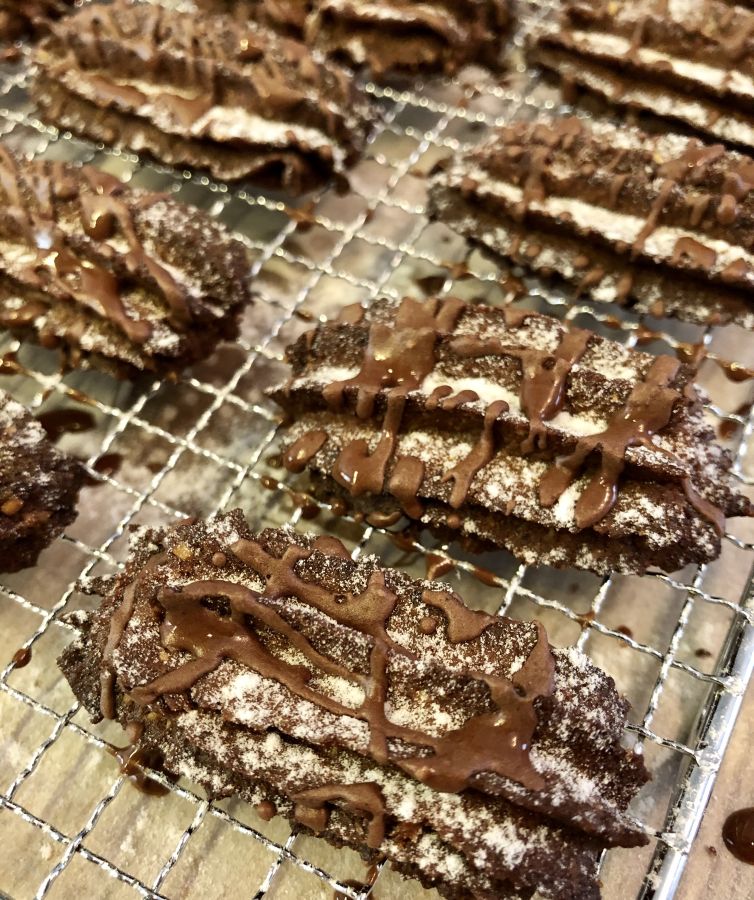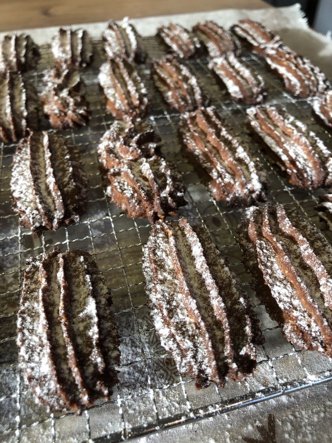 Mit einem Spritzbeutel die Hälfte der Stangen damit bespritzen und zusammensetzen.