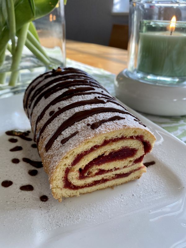 Den Biskuit mit dem feuchten Tuch vorsichtig aufrollen. (Ein Biskuit bricht NUR, wenn er zu trocken ist. Deswegen geben wir ihm etwas Feuchte mit.) TIPP: je nach gewünschter Dicke der Rolle die Langs- oder Breitseite aufrollen.
