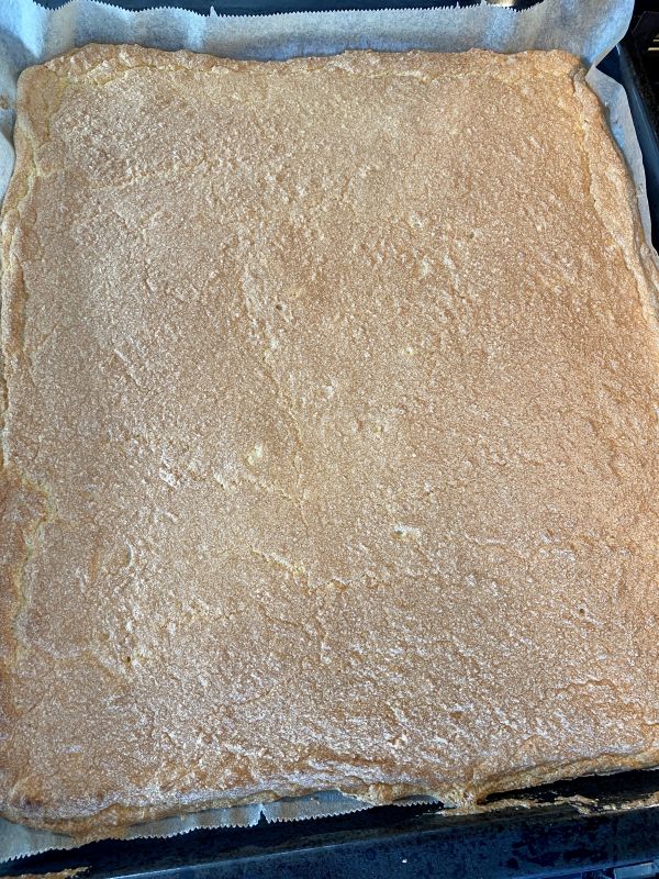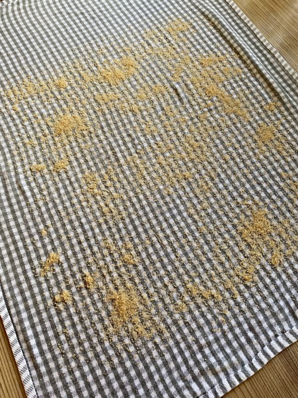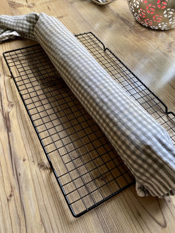 Während des Backens ein Geschirrtuch leicht befeuchten, auslegen und mit etwas Karamelltraum bestreuen.