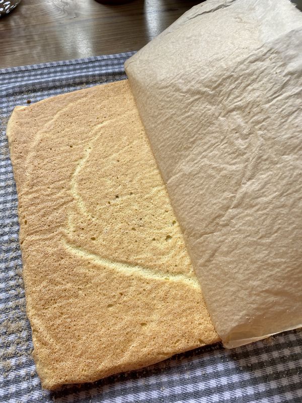 Nach dem Backen den Biskuit sofort auf das Geschirrtuch stürzen.