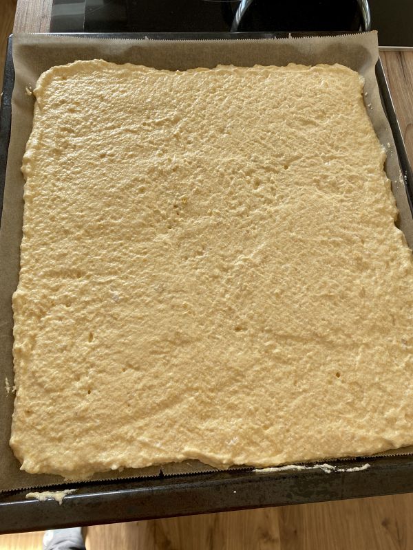 Bei 200 Grad Ober-Unterhitze ca. 12-15 Minuten backen. Bitte selbst auf Farbe achten und Temperatur und Zeit an eigenen Ofen anpassen. Ich verwende hier KEINE Umluft, da diese den Biskuit sehr austrocknet und dann die Rolle beim Aufrollen leichter bricht.