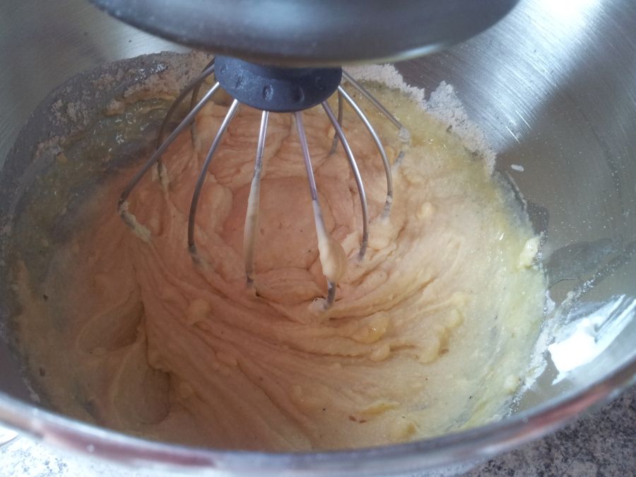 Die geschmolzene Butter zugeben und alles gründlich zu einem glatten Teig verrühren.