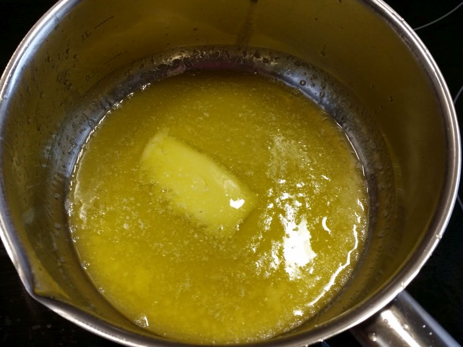 Die Butter schmelzen (nicht zu heiss, sie sollte gerade geschmolzen sein)…