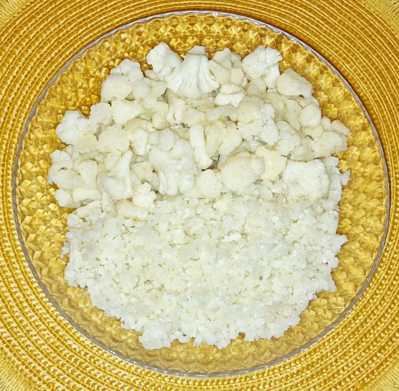 Vom abgetropften Blumenkohl 2/3 in einem Multizerkleiner grob zerkleinern. Nicht zu klein zerkleinern. Vom restlichen 1/3 ganz kleine Röschen zupfen. In einer Schale zur Seite stellen.